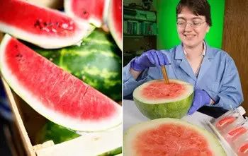 超标使用催熟剂、膨大剂和剧毒农药,这种西瓜皮上的条纹不均匀,切开后瓜瓤新鲜,瓜子呈白色,有异味。