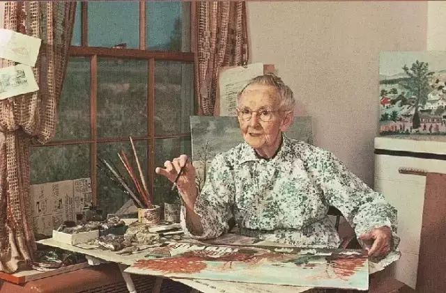 摩西奶奶(Grandma Moses,1860年9月7日—1961年12月13日),在美国可能是妇孺皆知的一个老太太,一个从来没有进过美术学校的农村女子,七十多岁的时候才因关节炎,已经拿不了针线,才拿起画笔,这个长寿的老太太活了101岁,留下了1000多幅油画作品,其中二十多幅是在过完100岁生日之后的画作。