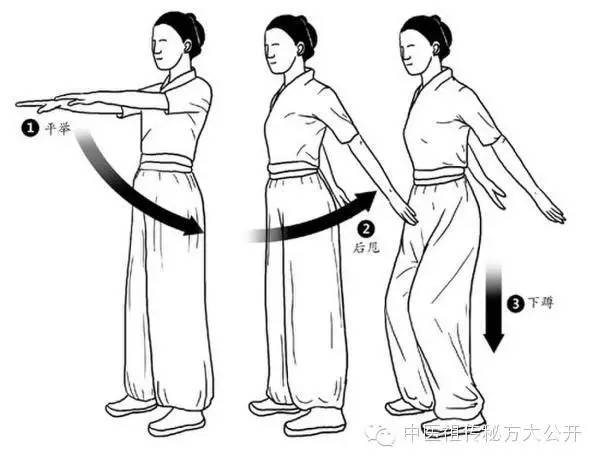腹生热、三焦通、疾病消! 一些肩膀酸痛的人,在坚持甩手一段时间后,疼病毛病全无,这些都是因为通过甩手打通了人体的奇经八脉,使气血更加流畅,这套甩手功的操作极简单,看图就能学会,关键还是坚持: 基本动作 双腿微屈站立,目微闭,双手展开,稍用力将两臂前后甩动。每次甩到第五下的时候,配合膝盖下蹲。