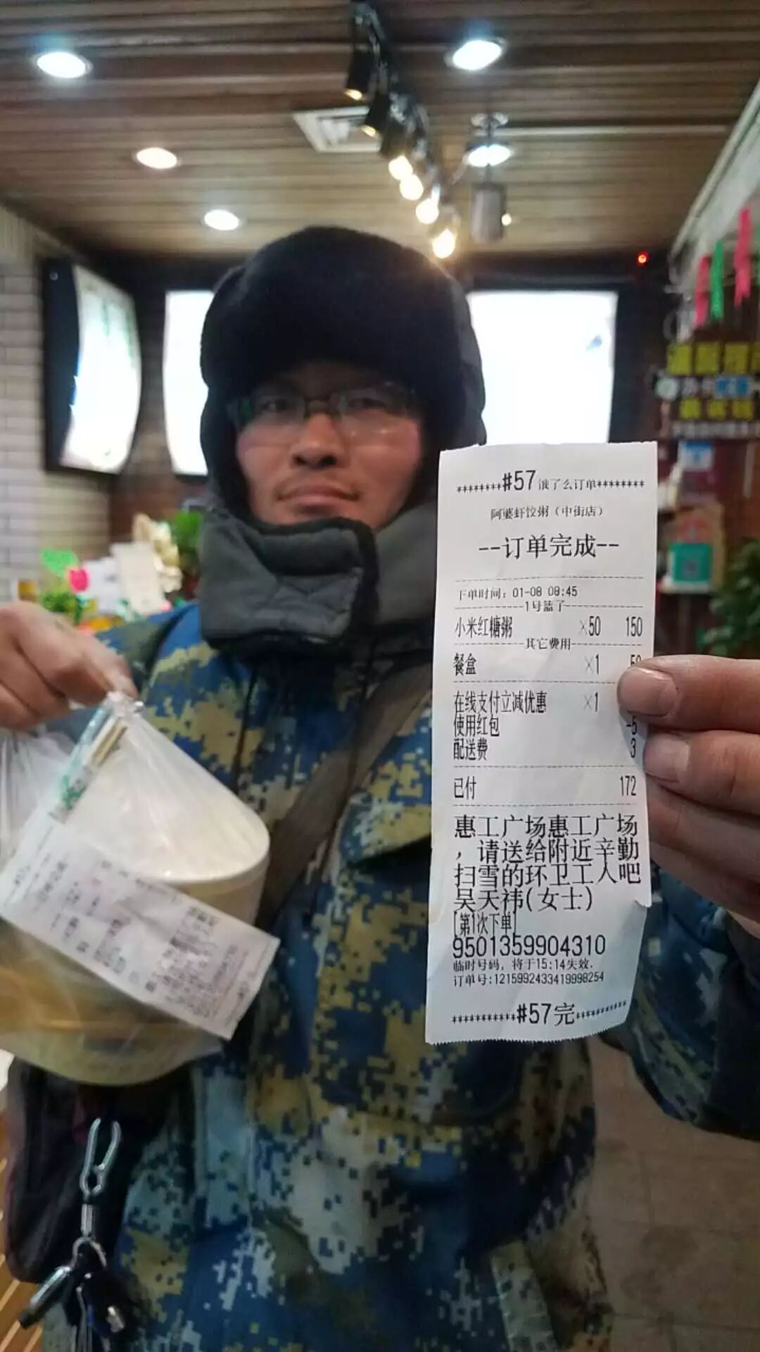 就通过外卖平台给他们订了50碗小米粥,
