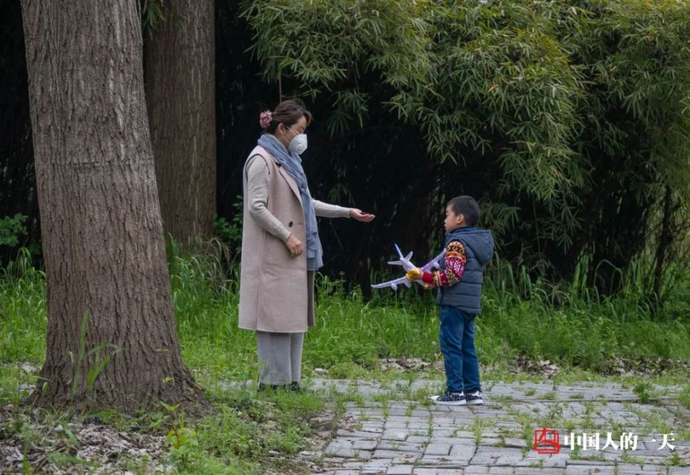 4月3日,武汉汉口江滩公园,妈妈给孩子送上摘来的花朵。湖北日报 柯皓/摄