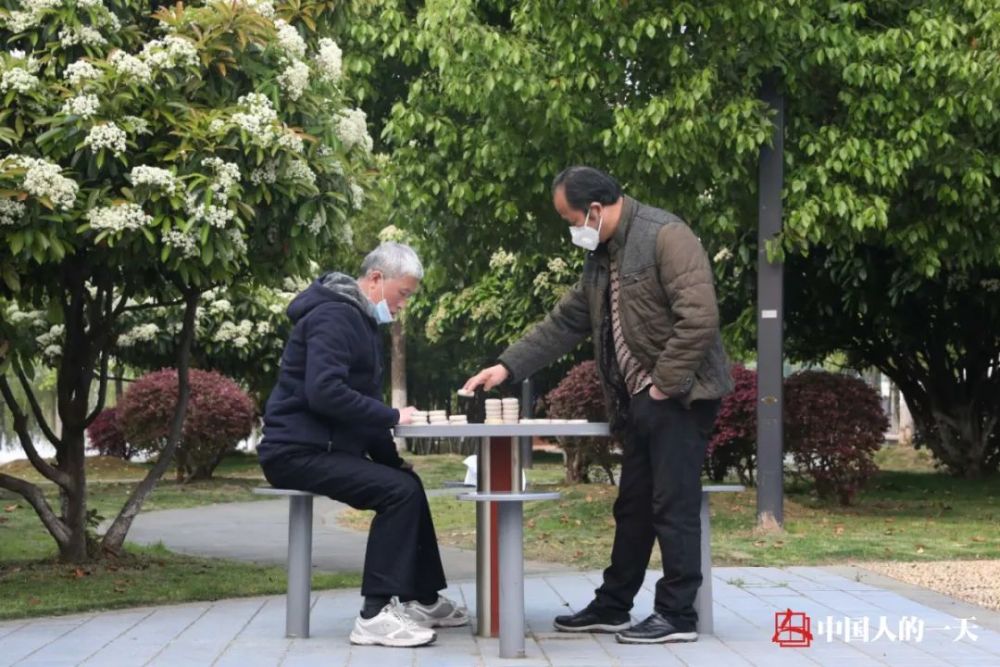4月3日,武汉武昌江滩,两位久别重逢的老棋友人。有朋/摄
