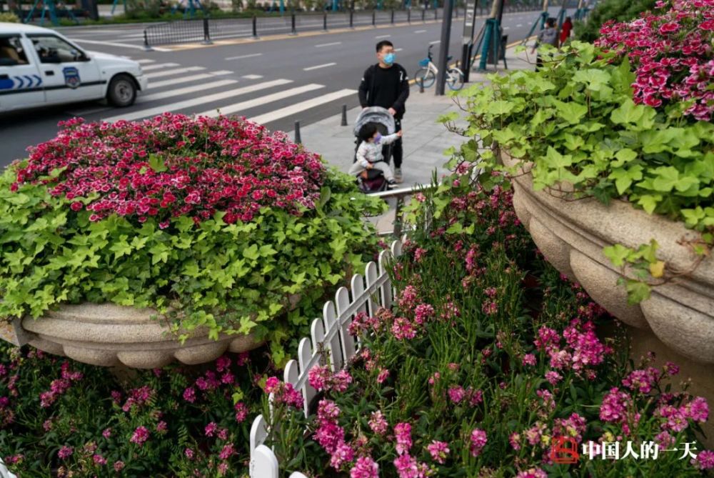 4月3日,武汉市沿江大道,市民推婴儿车散步赏花。马骁/摄