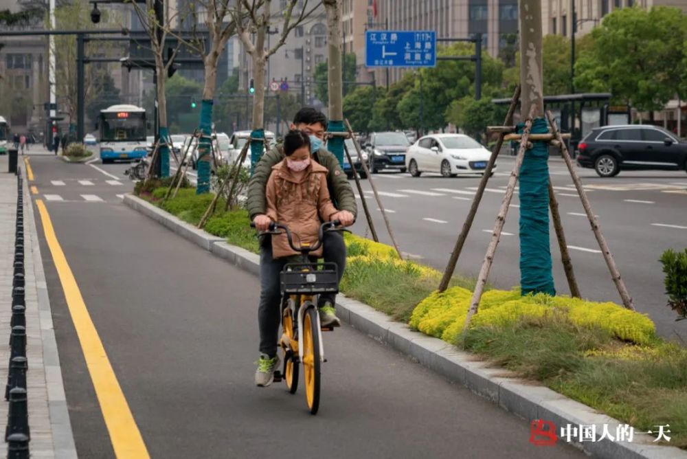 4月3日,武汉市沿江大道,一对父女在骑车。李累/摄