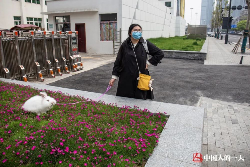 4月3日,武汉市沿江大道,一位市民带着宠物兔外出散步。马骁/摄