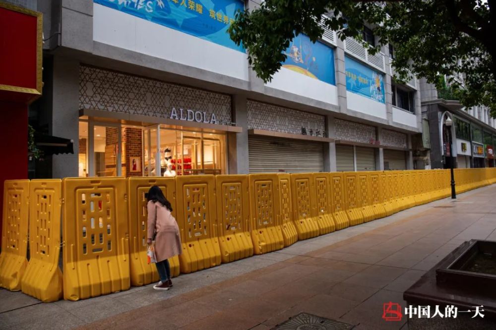 4月3日,武汉市江汉路,商铺陆续恢复营业,女孩透过防护栏观看店内情况。马骁/摄