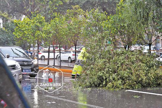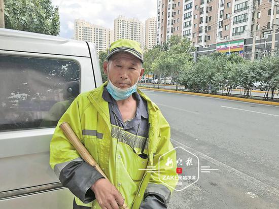 环卫工人白景林 “ 有啥可采访的,这是我分内的事 ” 第二个冒雨来推树的是道里区城管局保洁大队五中队 60 岁的白景林。寻找他相对容易,在工农大街上,新晚报记者很快就找到了正在扫树枝和落叶的他。