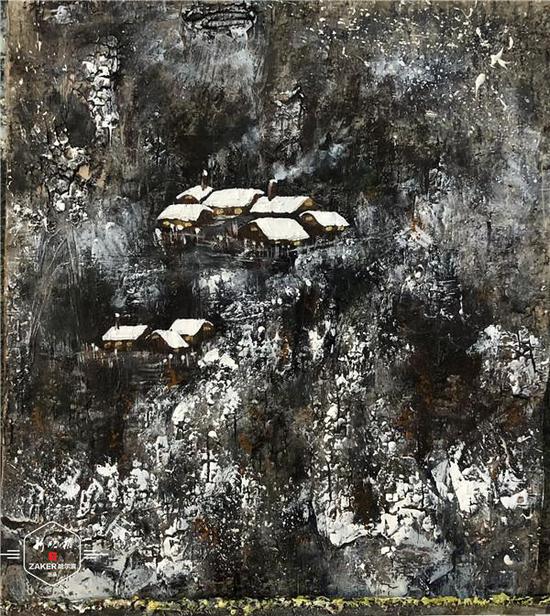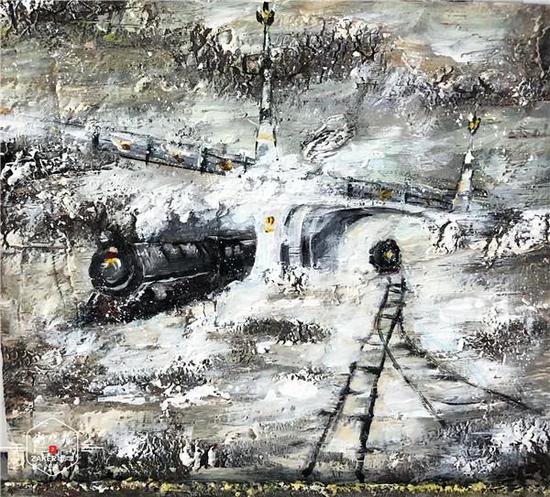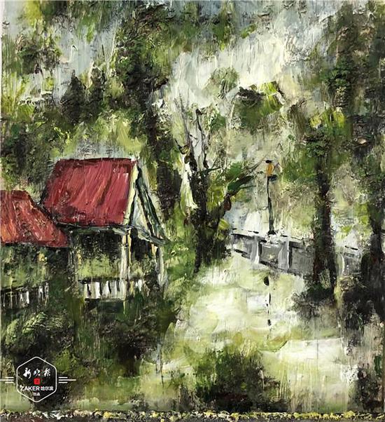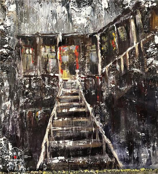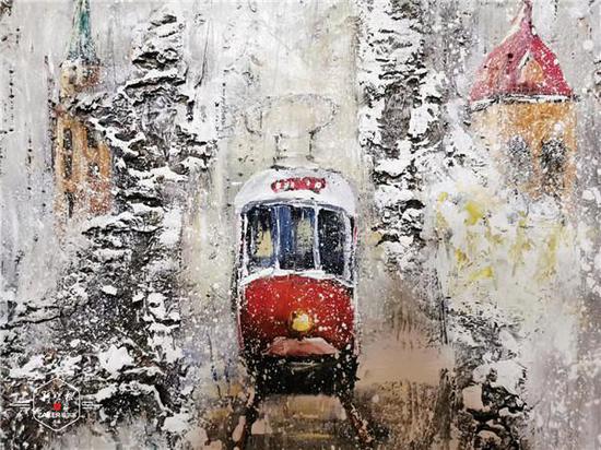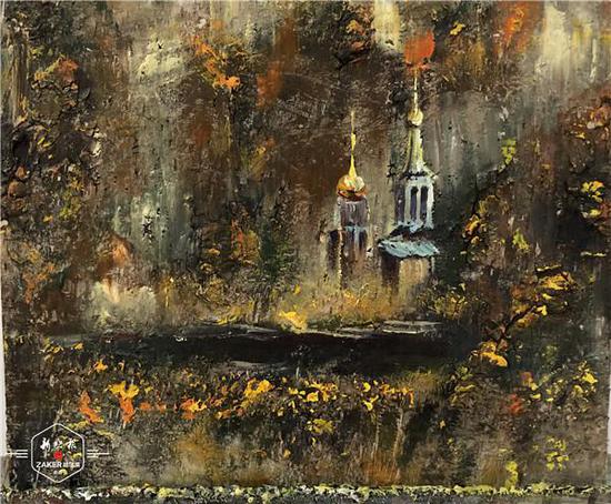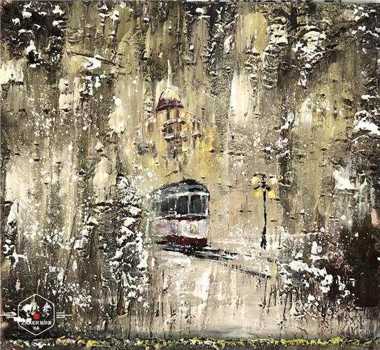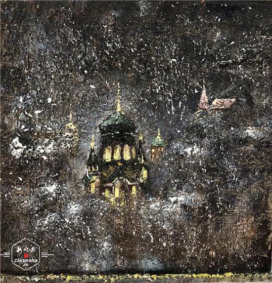 ↑ 城市记忆系列作品 唐德滨说,将油画与桦树皮相结合,并不是在桦树皮上画油画,而是要根据桦树皮的纹理将自己的构思做进去。