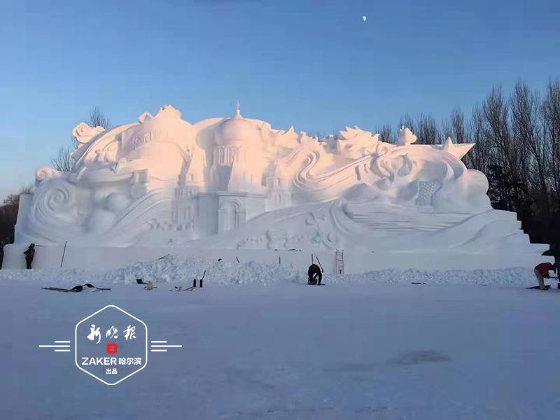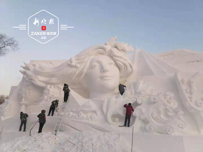 浪漫包裹的哈尔滨元素 《城市映画》长 33 米、高 12 米,用雪量达 3000 多立方米,是本届雪博会上专门表现城市特色建筑的大型主题雪塑。索菲亚教堂、哈尔滨大剧院是《城市映画》的主角,同时配有 “ 音乐之都 ” 流动的五线谱、跳跃的音符;《世纪回眸》用雪量 2000 多立方米,长 24 米、高 14 米,厚度 8 米,主景是一位美丽的冰雪女神,左下方和右上方植入了哈尔滨地标——龙塔剪影、原车辆厂中东铁路火车头。折衷主义的建筑、美丽的女神、四溢的哈尔滨元素,都在用自由浪漫的方式表达城市的热情。