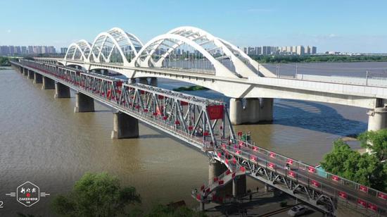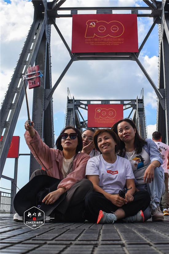 6 月 20 日,记者来到还在施工中的 “ 祝福桥 ” 时,正赶上来自天津、四川等地的旅行团来到这里打卡游览。看到百年滨洲铁路桥在红旗点缀下的壮丽景象时,来自天津的廖女士拿出手机,在同伴的帮助下完成了自己与 “ 祝福桥 ” 的合影。