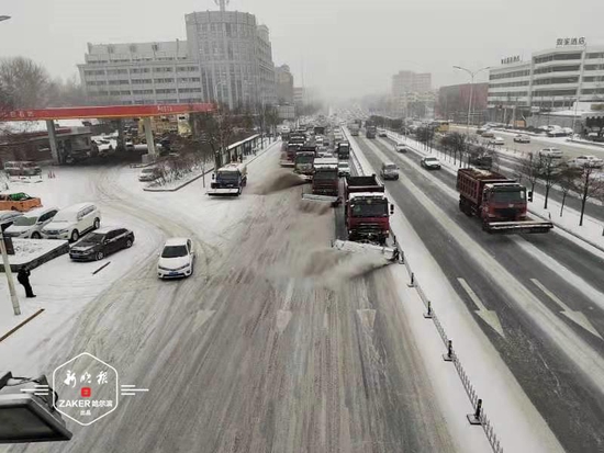 11 日下午,记者在中山路、文昌桥路段等主干街路看到,城管环卫部门大型滚清雪机械梯队作业,提升主干街路清雪效率。在人行道上,身穿环卫工服的环卫工人则正在路边人,配合机械进行攒堆作业。