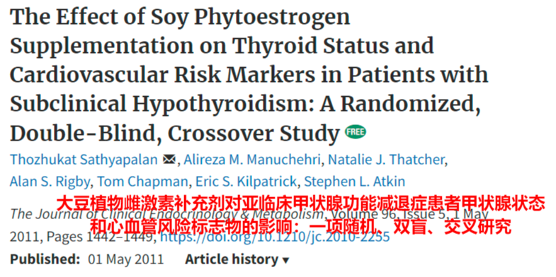 一项随机、双盲、交叉研究目的旨在,确定大豆植物雌激素是否会对甲状腺功能产生影响,从而来评估对亚临床甲状腺功能减退症患者心血管风险指数。⑩