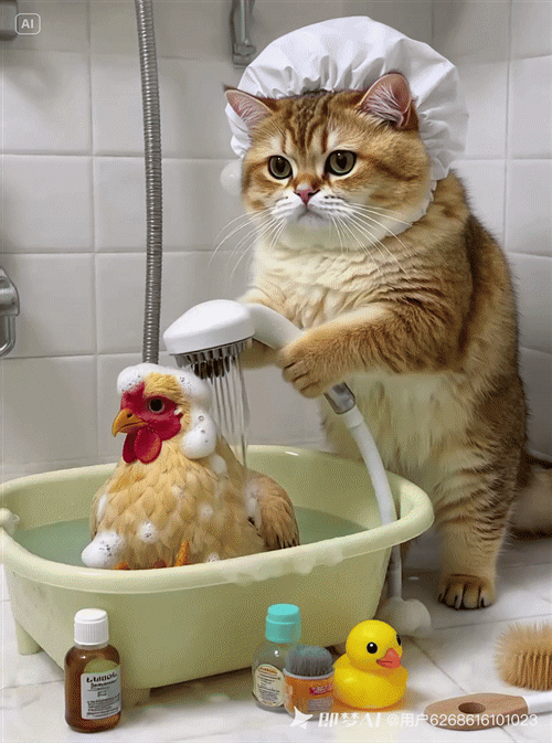 欣赏潇老师AI制作美图: 猫给鸡沐浴