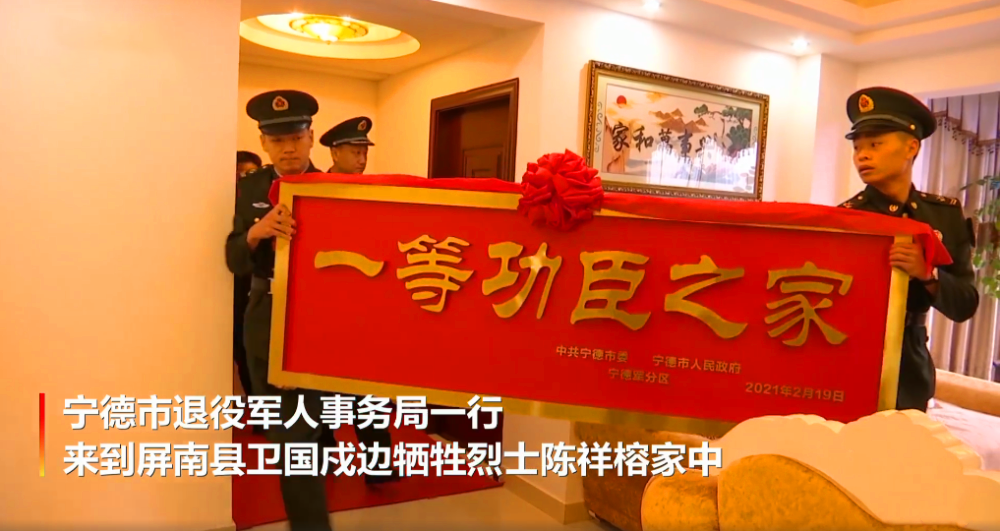 不久前,福建宁德军分区、宁德市退役军人事务局一行,来到屏南县卫国戍边牺牲烈士陈祥榕家中,看望慰问烈士遗属,并送上“一等功臣之家”匾额。